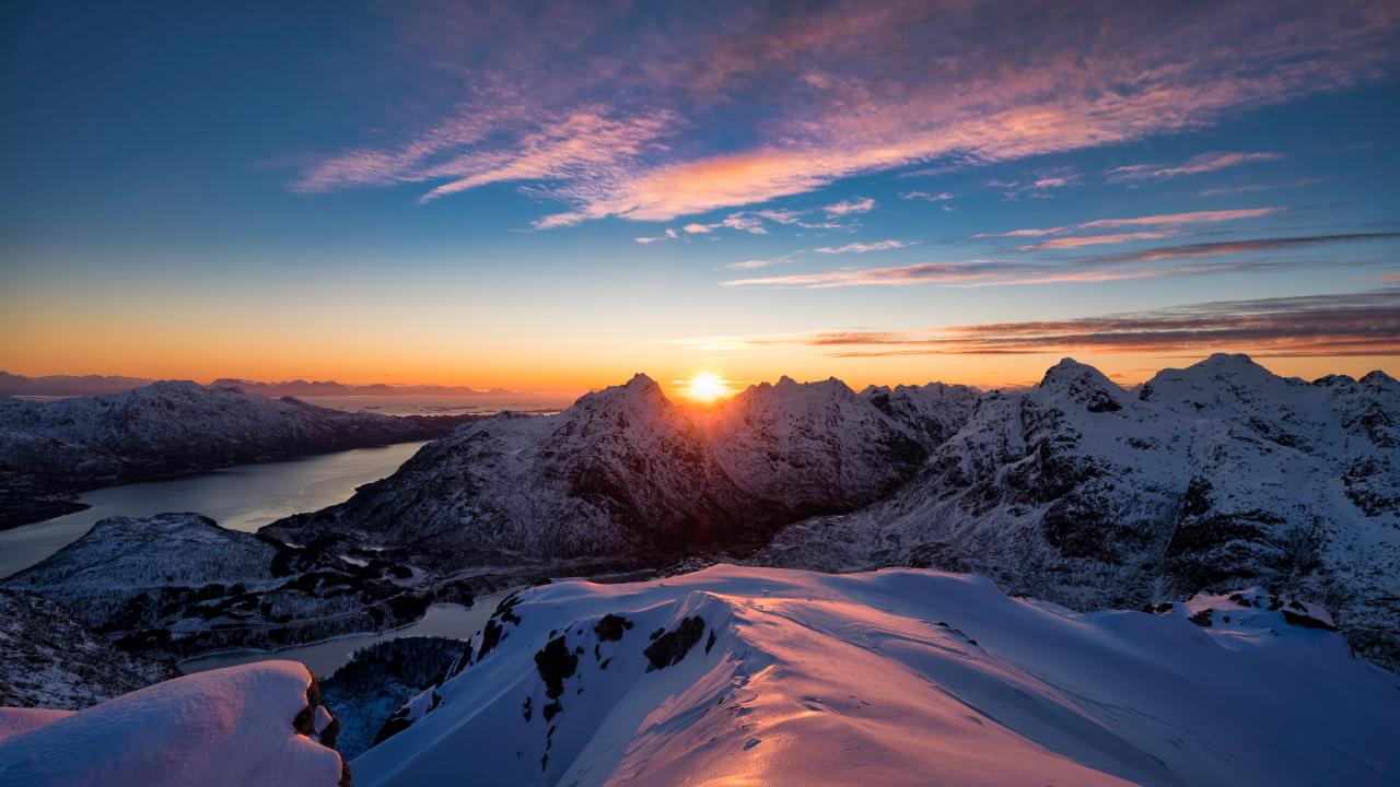 Обои Восход яркого солнца над заснеженными горами, Норвегия