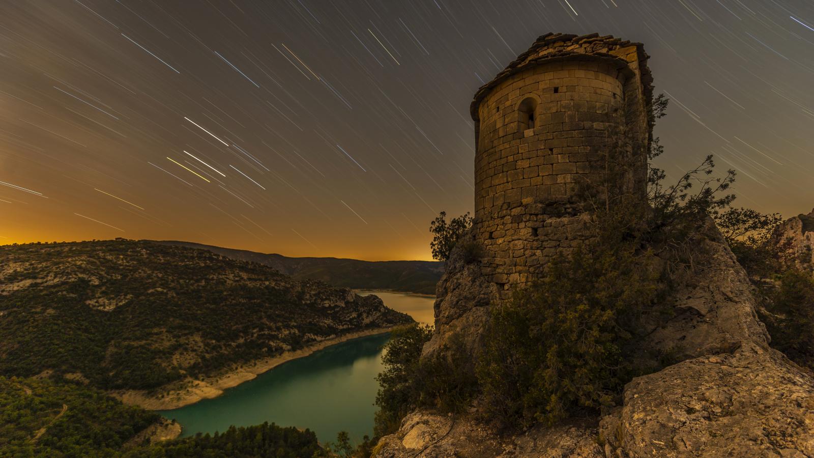 Обои Ночной звездопад в небе над церковью La Pertusa, Испания