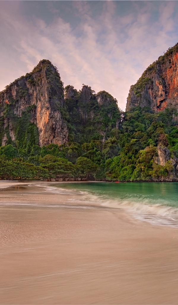 Обои Покрытые зеленью скалы на берегу океана, Таиланд