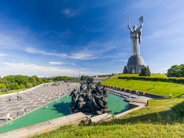 Обои Вид на памятник Родина Мать под голубым небом, Киев, Украина