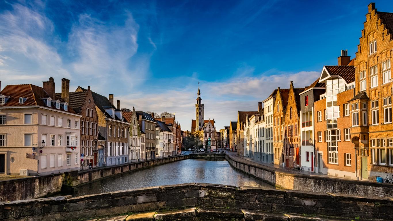 Обои Дома в городе Брюгге на фоне голубого неба, Бельгия