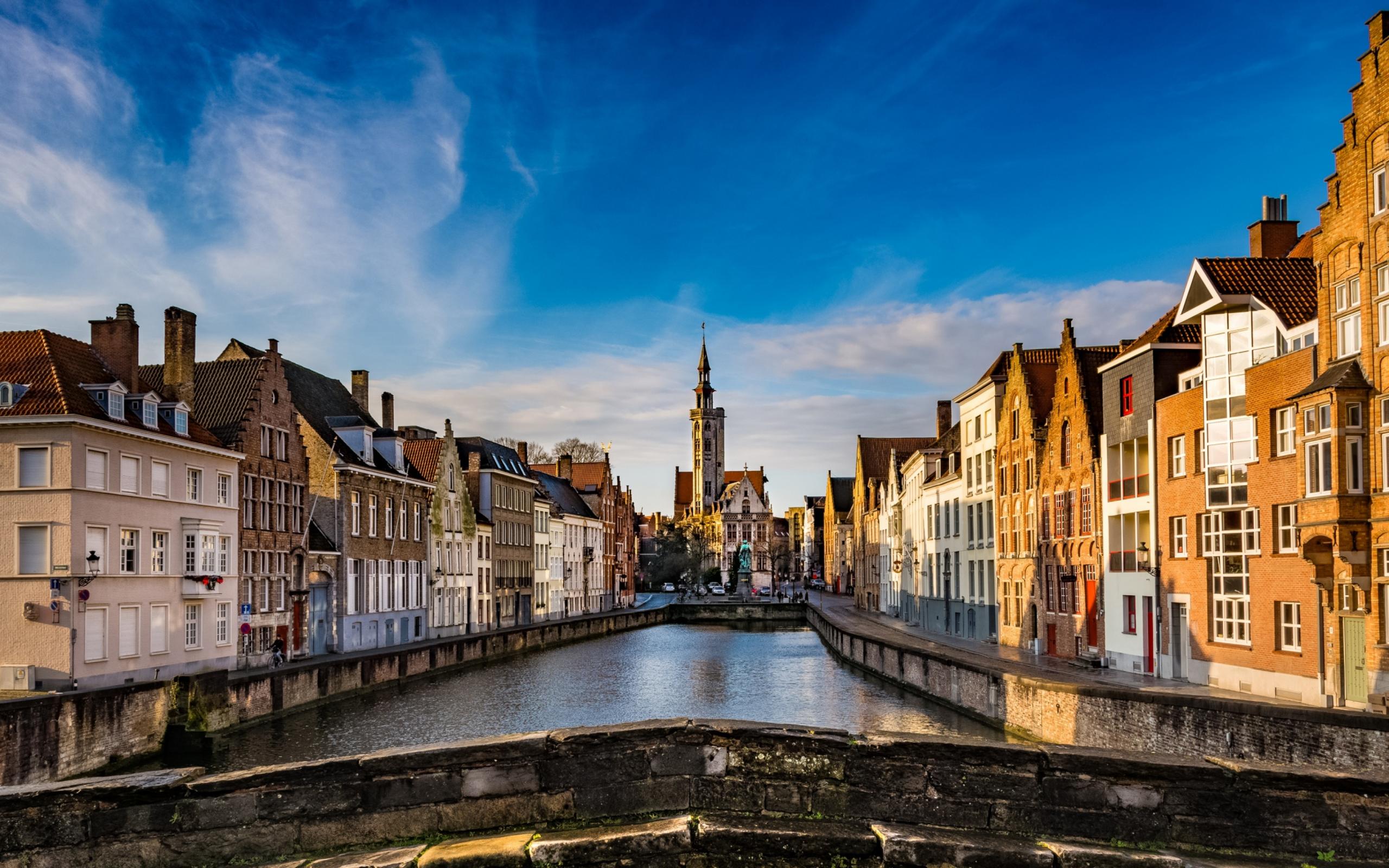 Обои Дома в городе Брюгге на фоне голубого неба, Бельгия