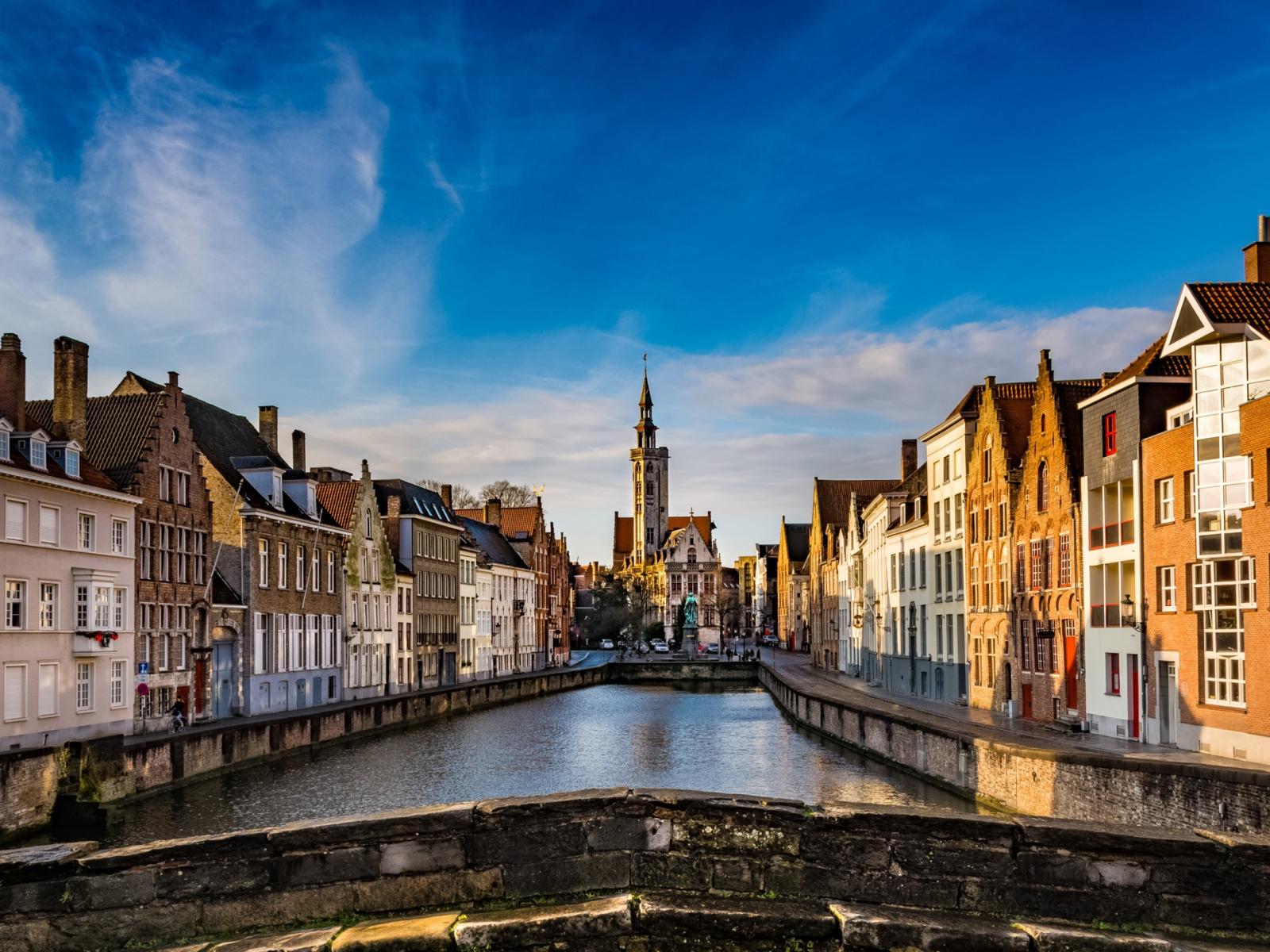 Обои Дома в городе Брюгге на фоне голубого неба, Бельгия