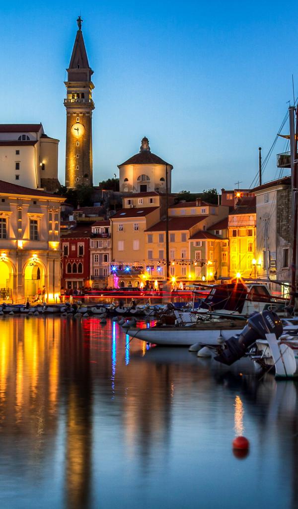 Обои Дома на берегу реки ночью, Словения
