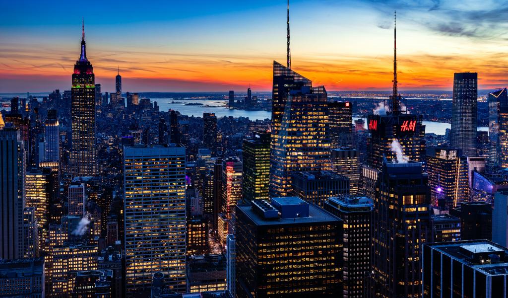 Обои Высокие ночные небоскребы под красивым небом на закате