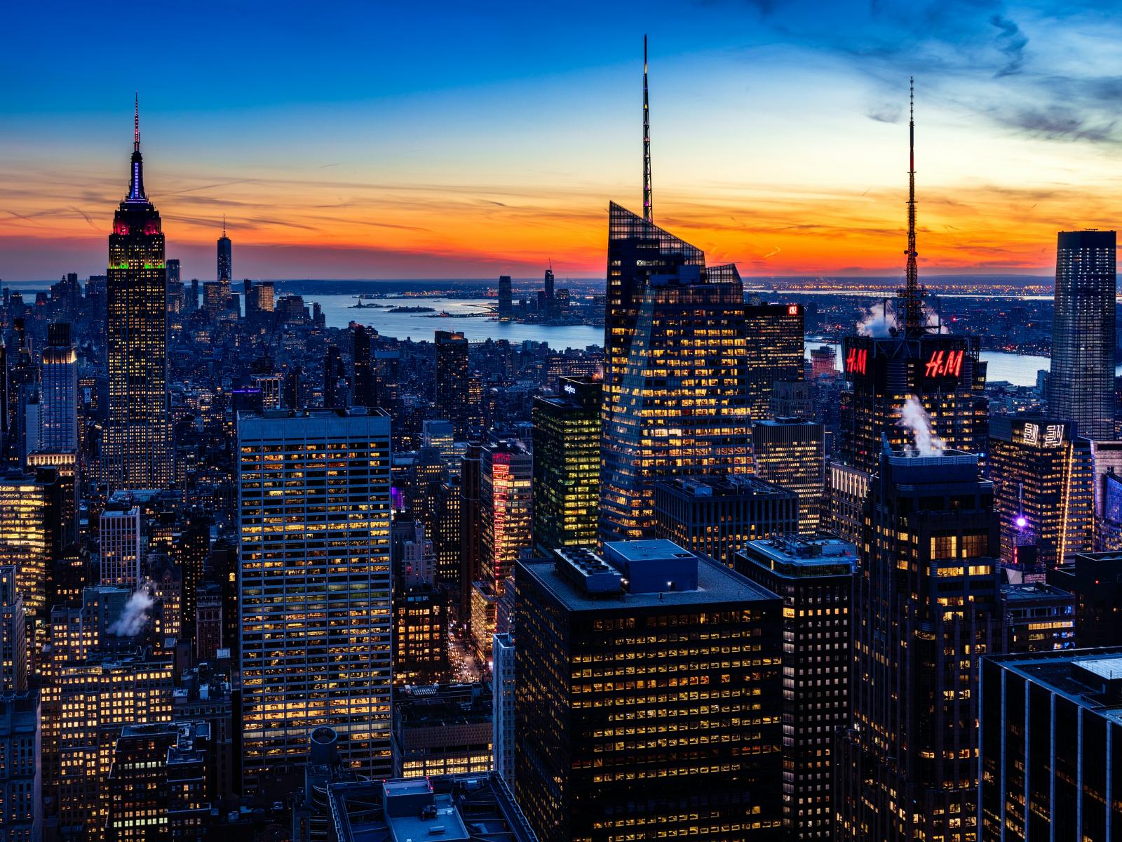 Обои Высокие ночные небоскребы под красивым небом на закате