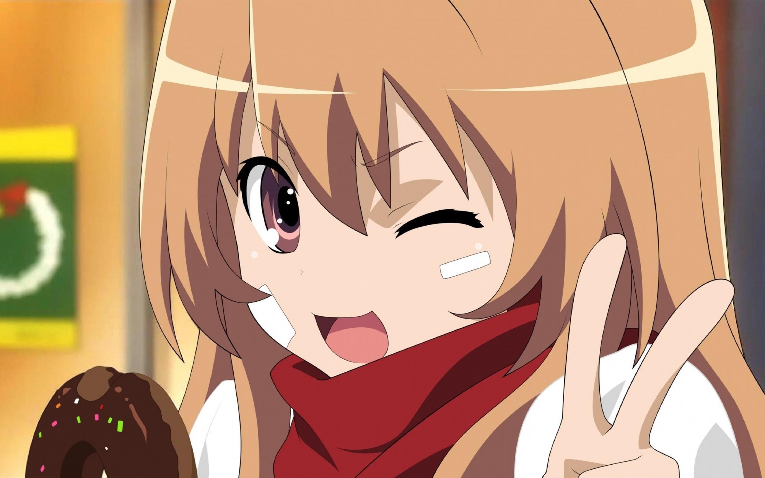 Обои Девушка аниме кушает пончик и подмигивает