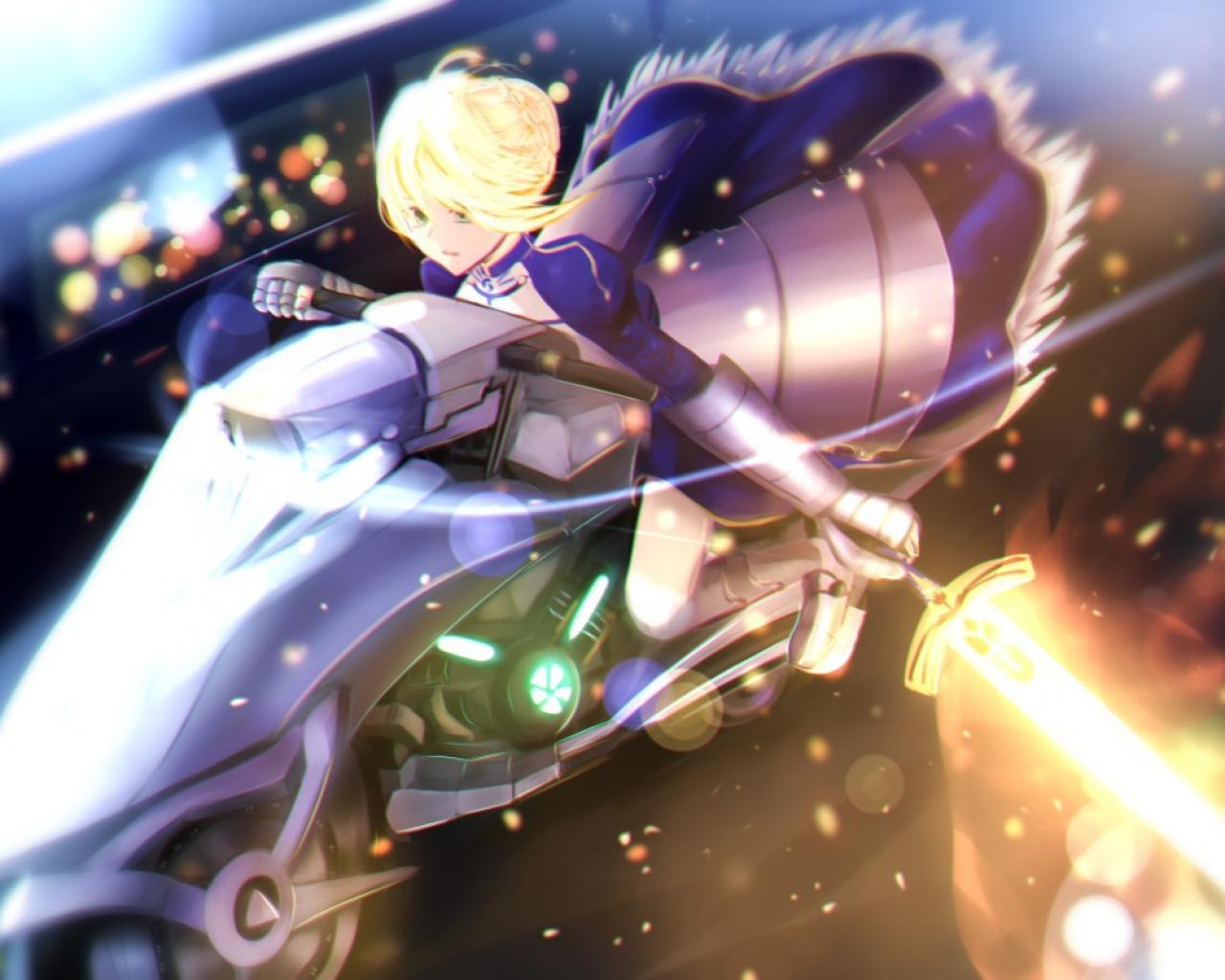 Обои Блондинка Сайбер мчится на мотоцикле в аниме Fate Series