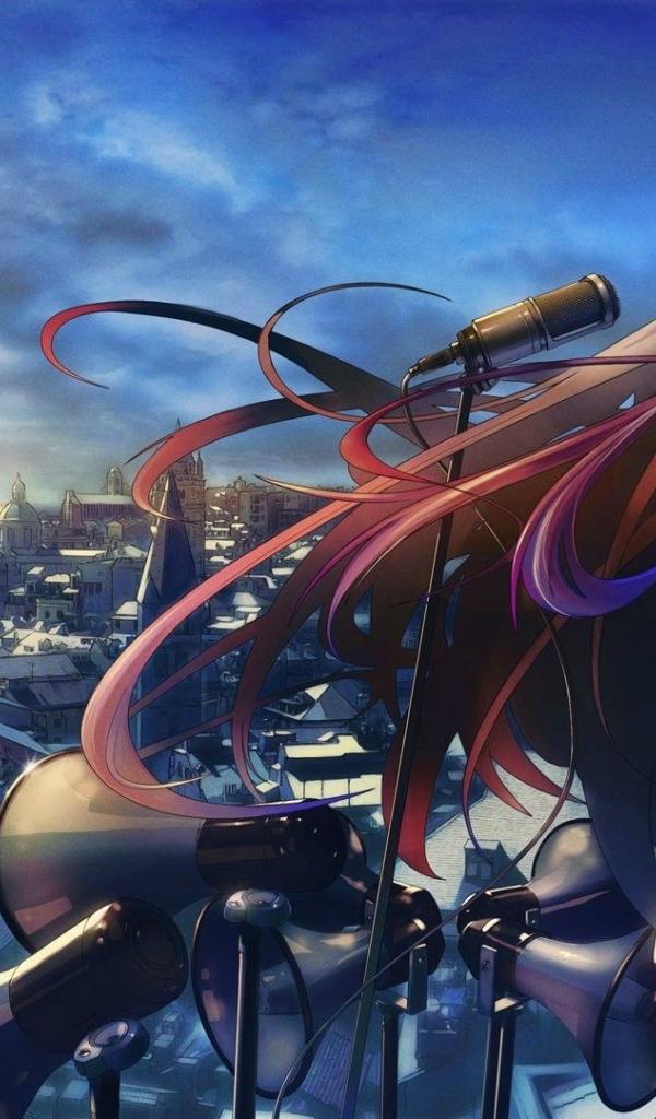 Обои Девушка аниме поет на крыше дома