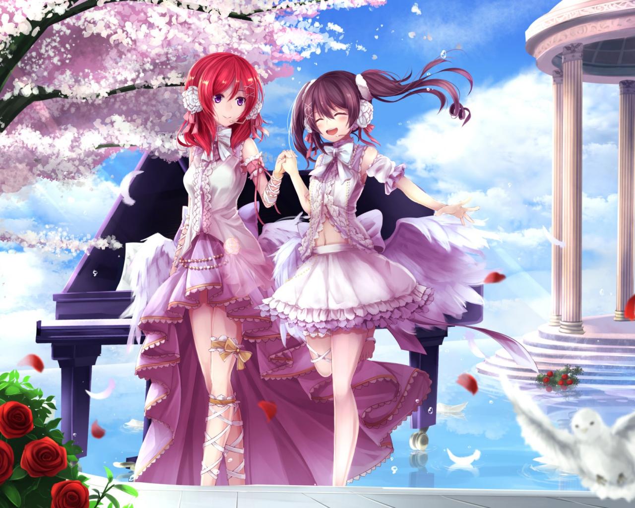 Обои Девушки в розовых платьях Maki Nishikino и Yazawa Nico аниме Love Live!