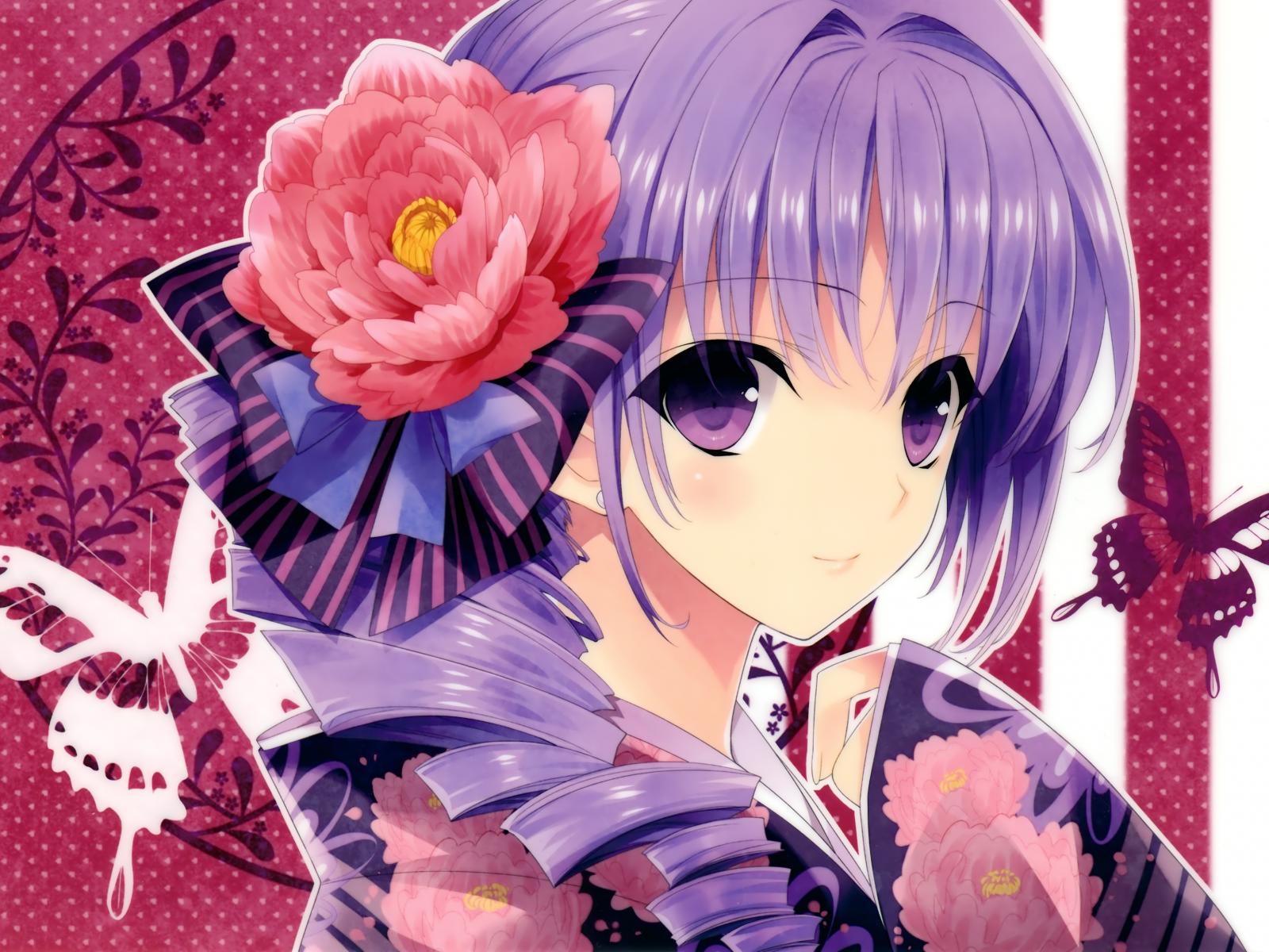 Обои Девушка аниме в кимоно и большим красным цветком в волосах