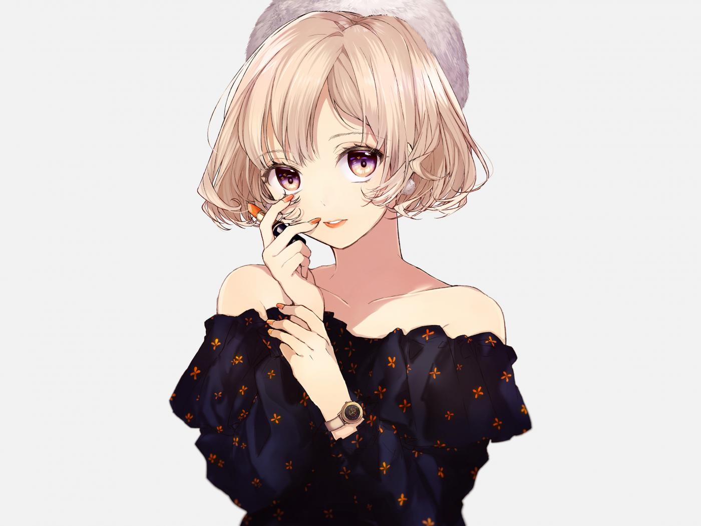 Обои Девушка аниме блондинка с помадой в руках на белом фоне