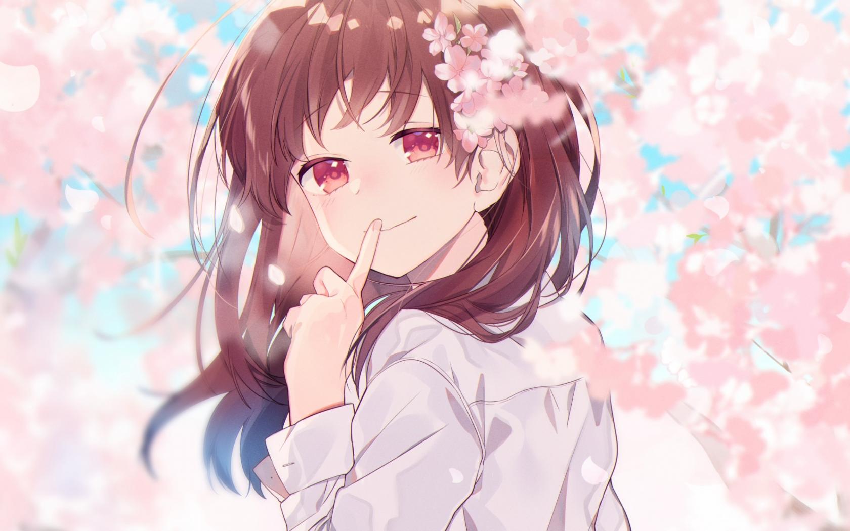 Обои Девушка аниме с цветами сакуры в волосах