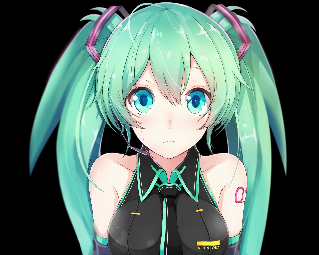 Обои Девушка аниме Мику Хацунэ с голубыми волосами на черном фоне
