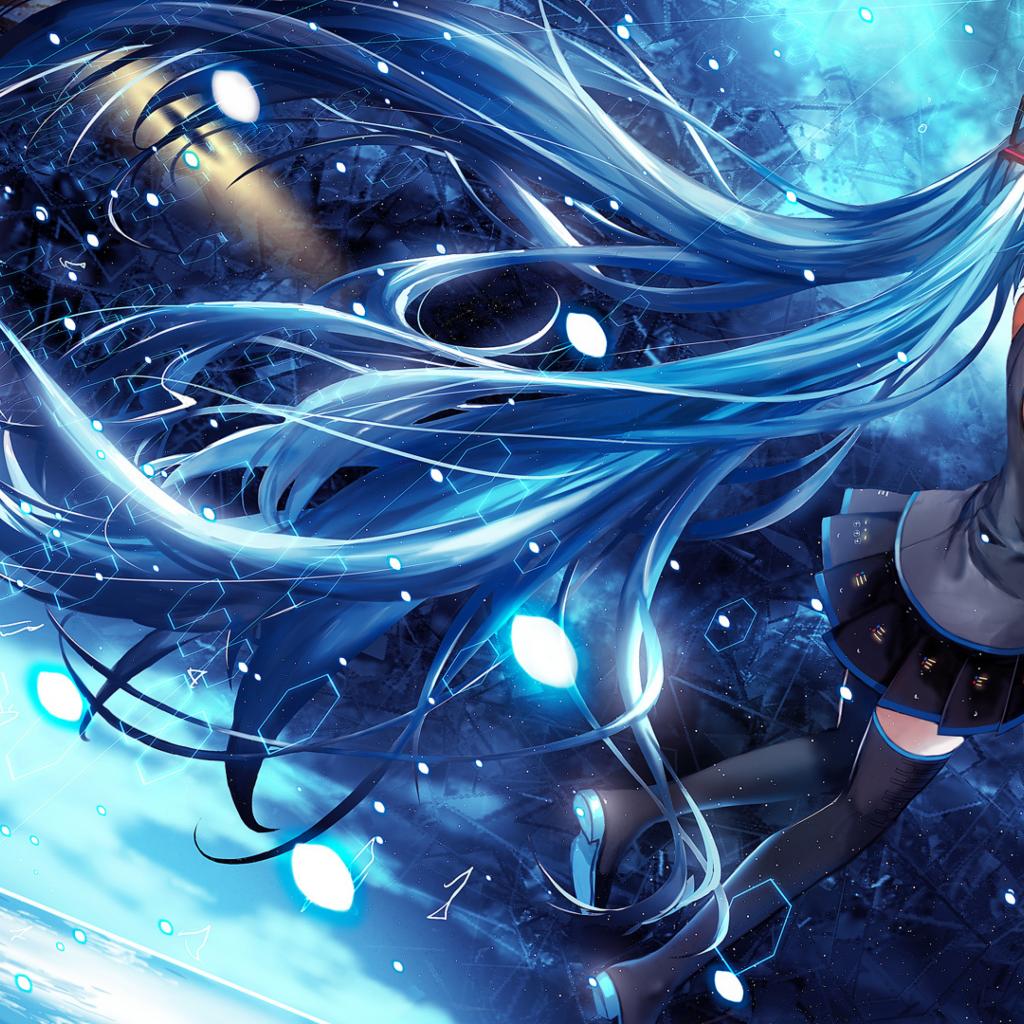 Обои Девушка аниме Мику Хацунэ с длинными голубыми волосами в космосе