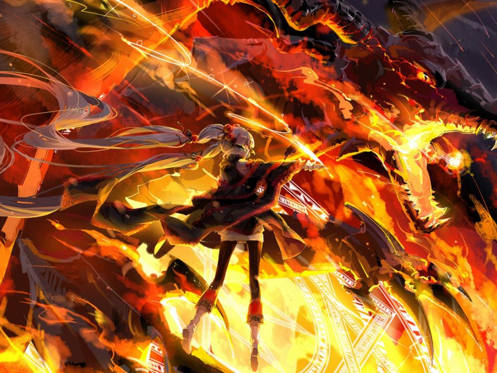 Обои Сражение с огненным драконом, аниме Pixiv Fantasia