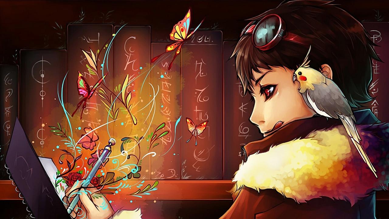Обои Попугай на плече аниме девушки