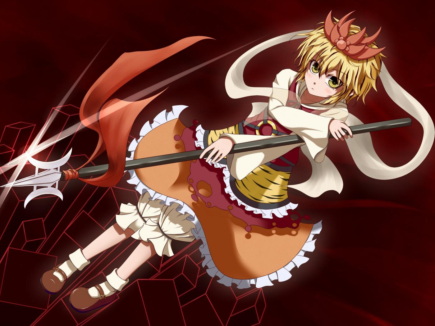 Обои Девушка с копьем на красном фоне, Девочка-волшебница Мадока