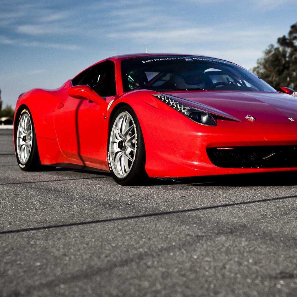 Обои Красный спортивный автомобиль на гладком сером асфальте