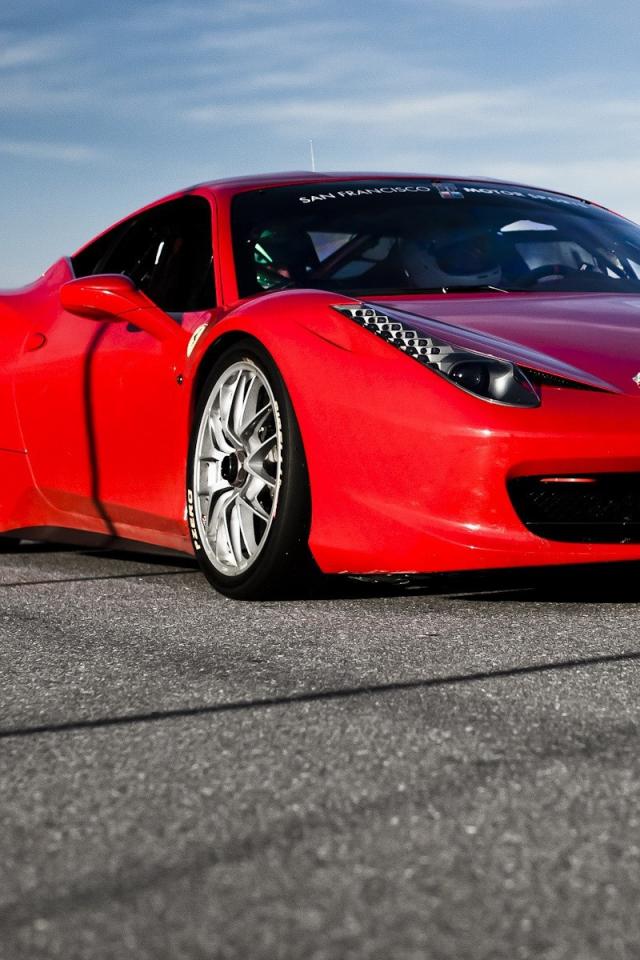 Обои Красный спортивный автомобиль на гладком сером асфальте