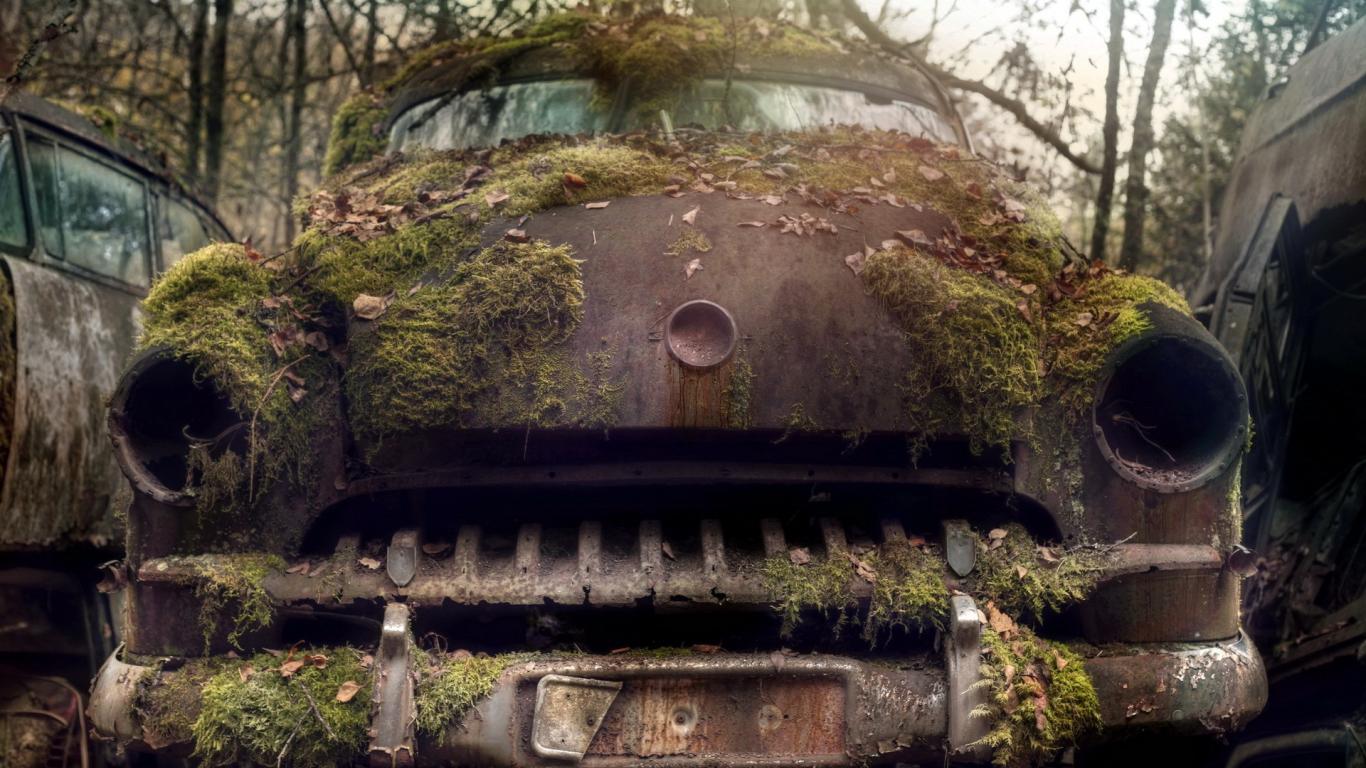 Обои Ржавый корпус старого авто порос мхом