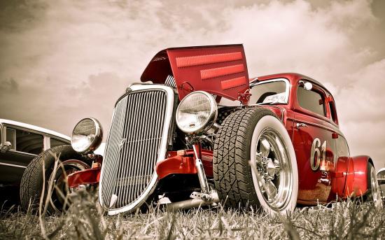 Обои Красный ретро автомобиль с открытым капотом