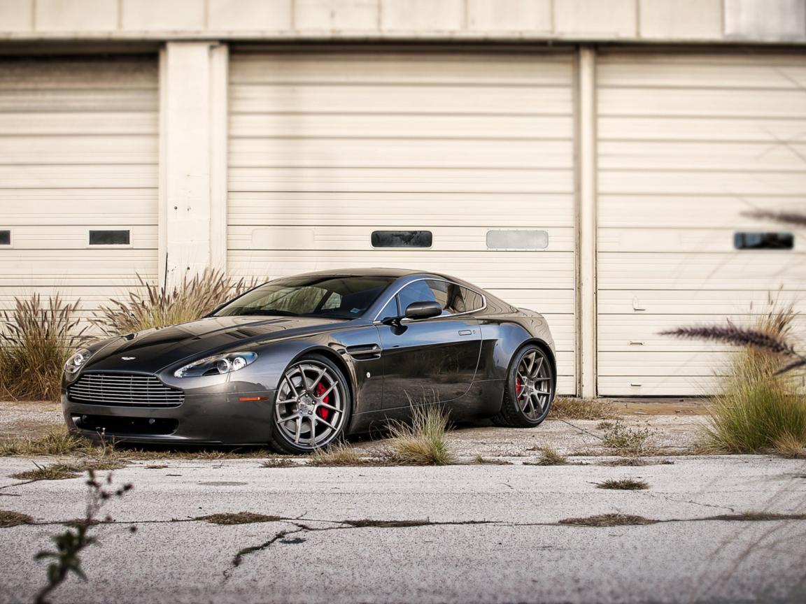 Обои Черный Aston Martin в ворот белого ангара