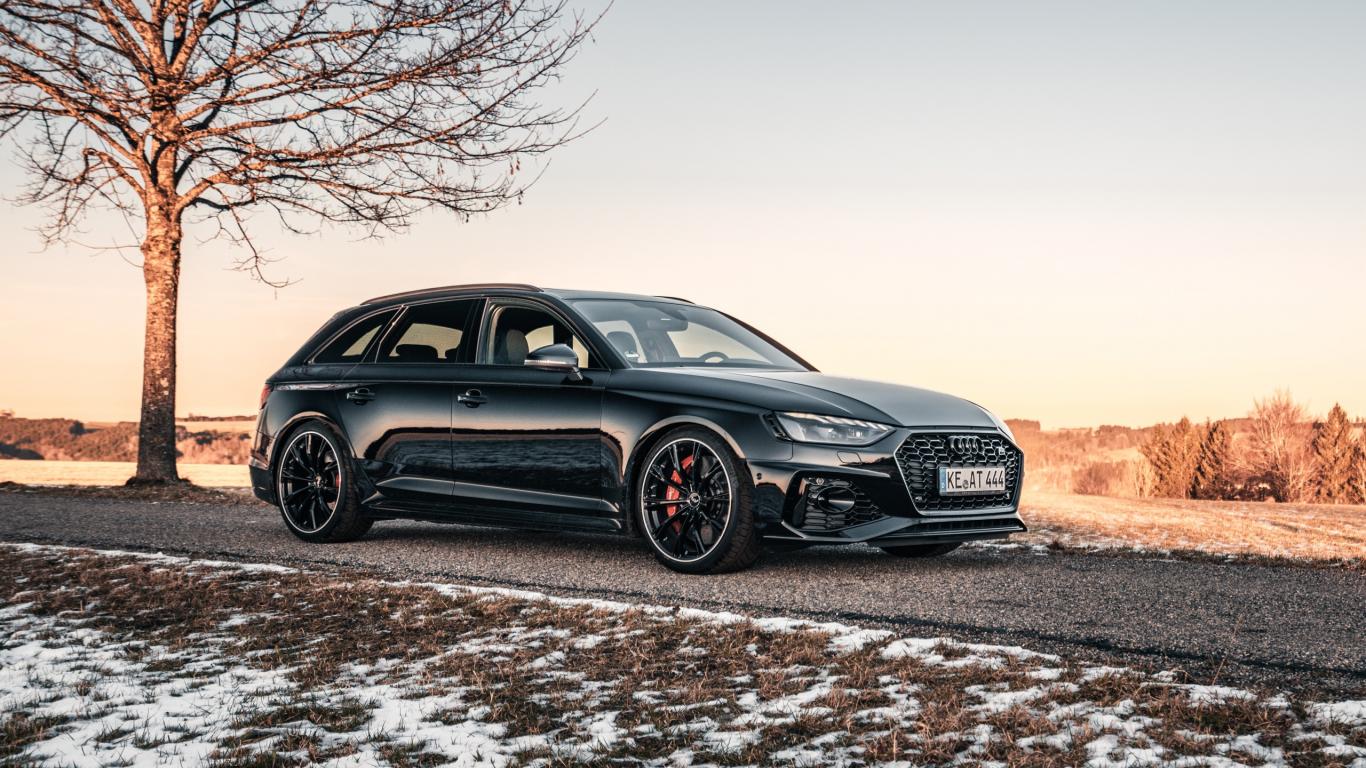 Обои Черный автомобиль Audi RS 4 Avant 2020 года на дороге у дерева