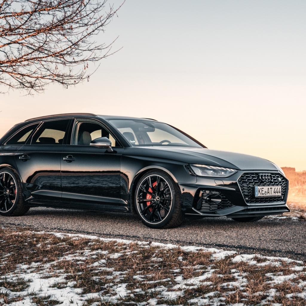 Обои Черный автомобиль Audi RS 4 Avant 2020 года на дороге у дерева