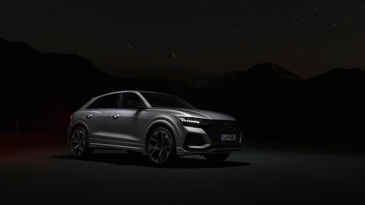 Обои Серебристый автомобиль Audi RS Q8 2020 года ночью
