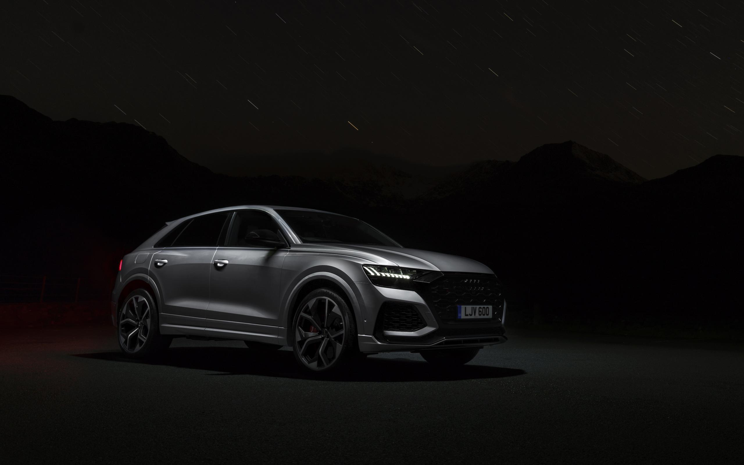 Обои Серебристый автомобиль Audi RS Q8 2020 года ночью