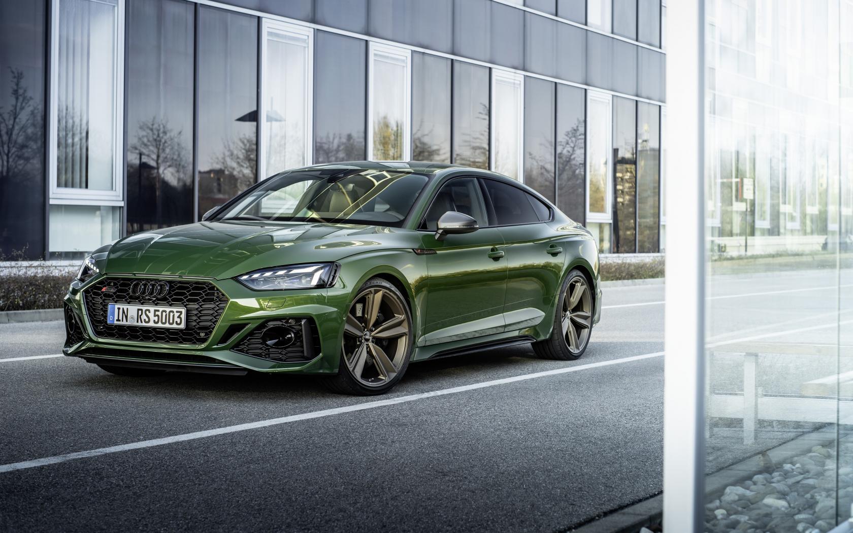 Обои Зеленый автомобиль Audi RS 5 Sportback 2020 года у здания