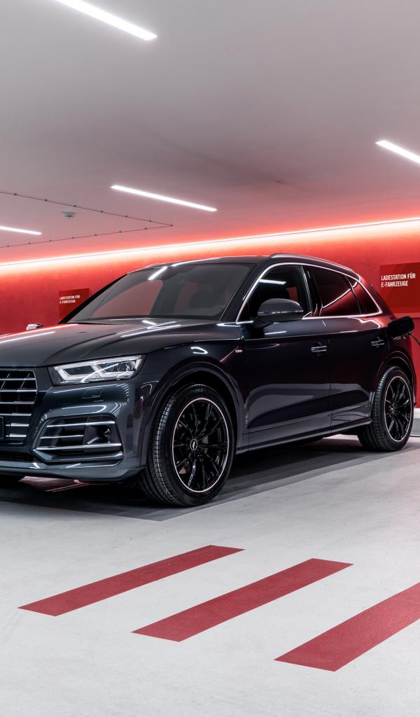 Обои Черный автомобиль ABT Audi Q5 55 TFSI E 2020 года на заправке