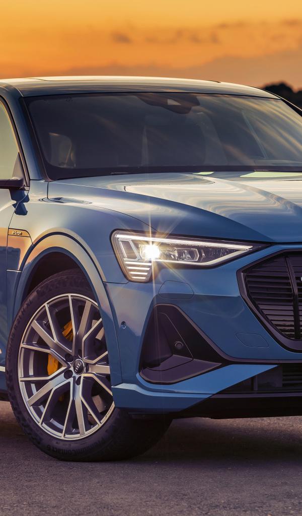 Обои Синий автомобиль Audi E-Tron 55 Quattro S Line 2020 года на закате