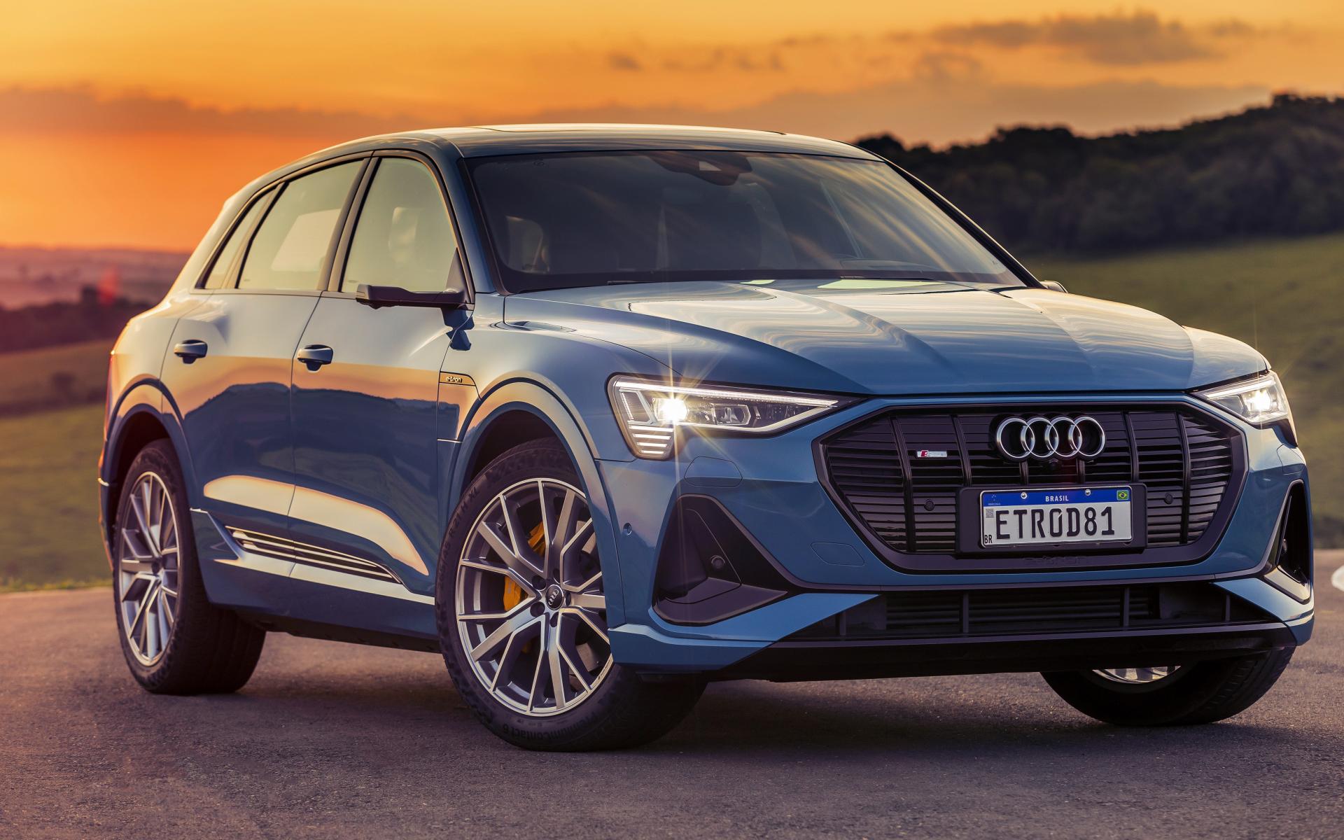 Обои Синий автомобиль Audi E-Tron 55 Quattro S Line 2020 года на закате