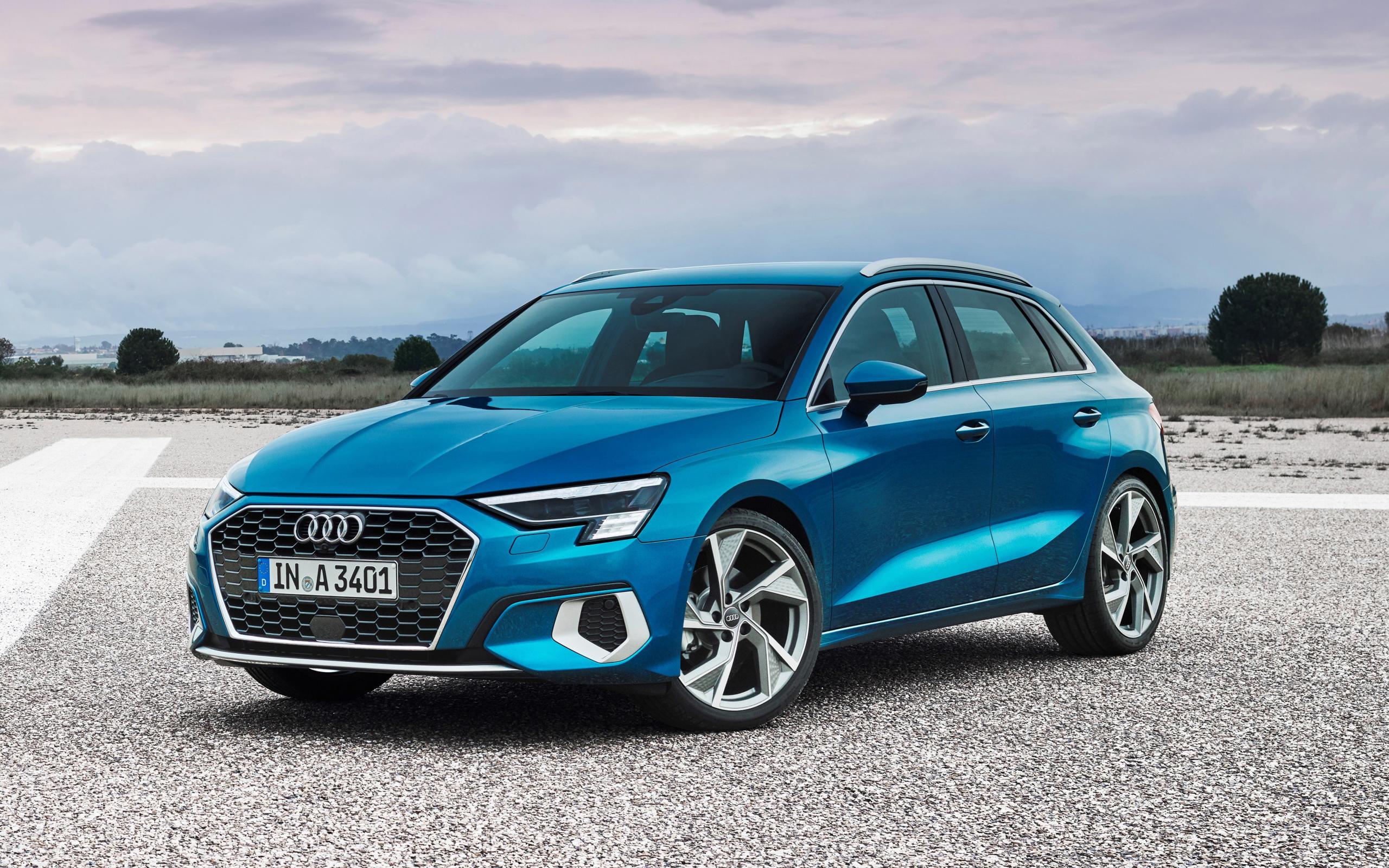 Обои Синий автомобиль Audi A3 Sportback 35 TFSI 2020 года на асфальте