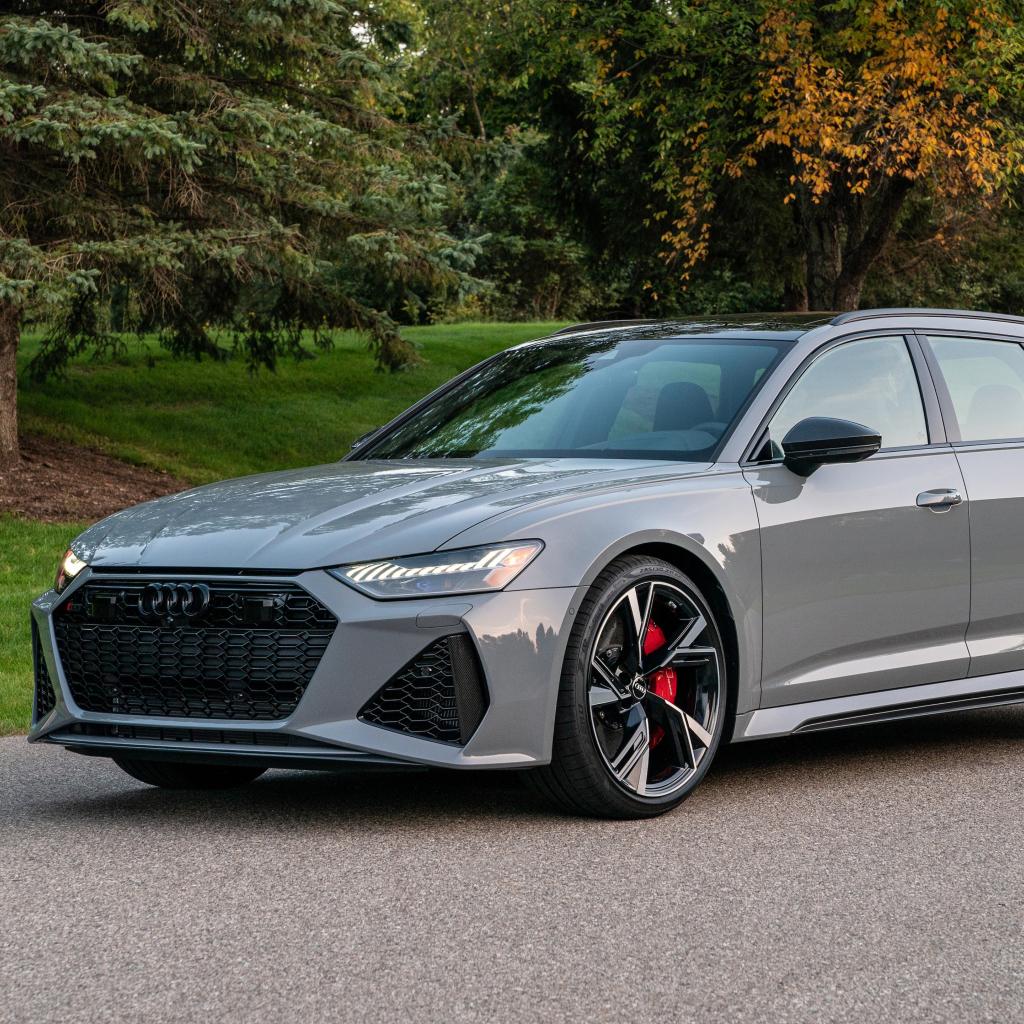Обои Серебристый автомобиль Audi RS 6 Avant, 2021 года вид спереди