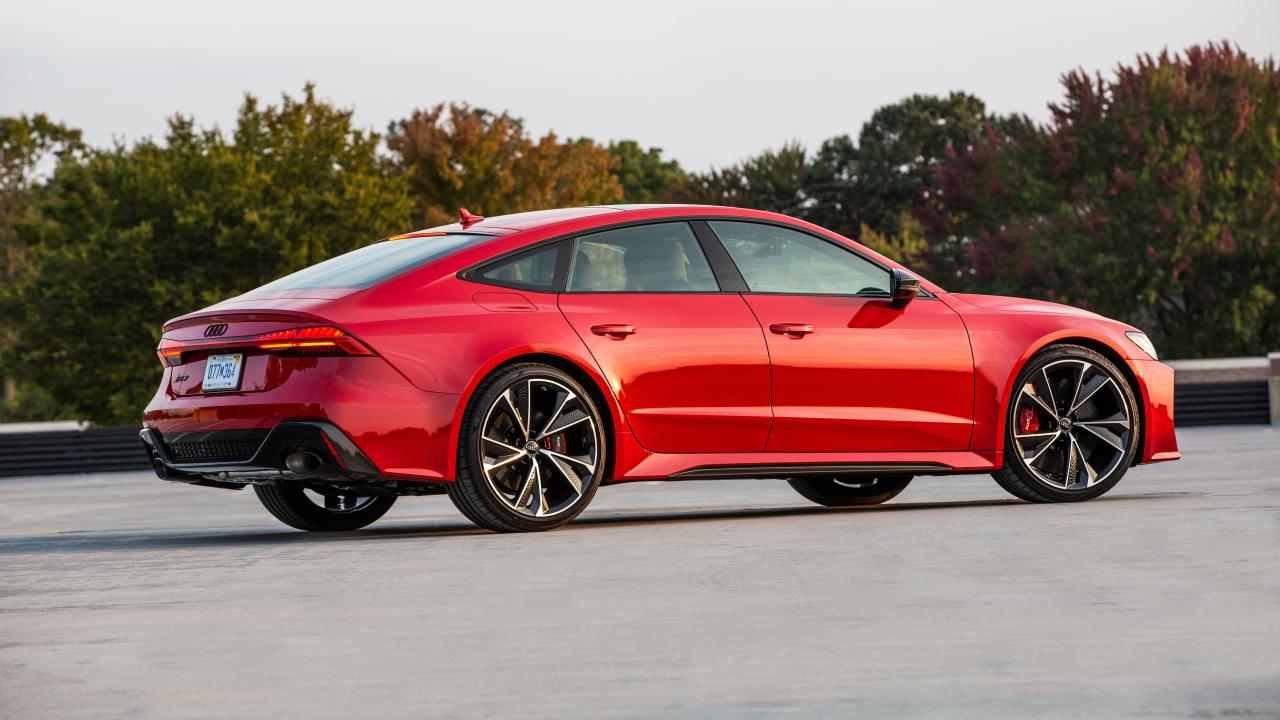 Обои Красный автомобиль Audi RS 7 Sportback, 2021 года вид сбоку