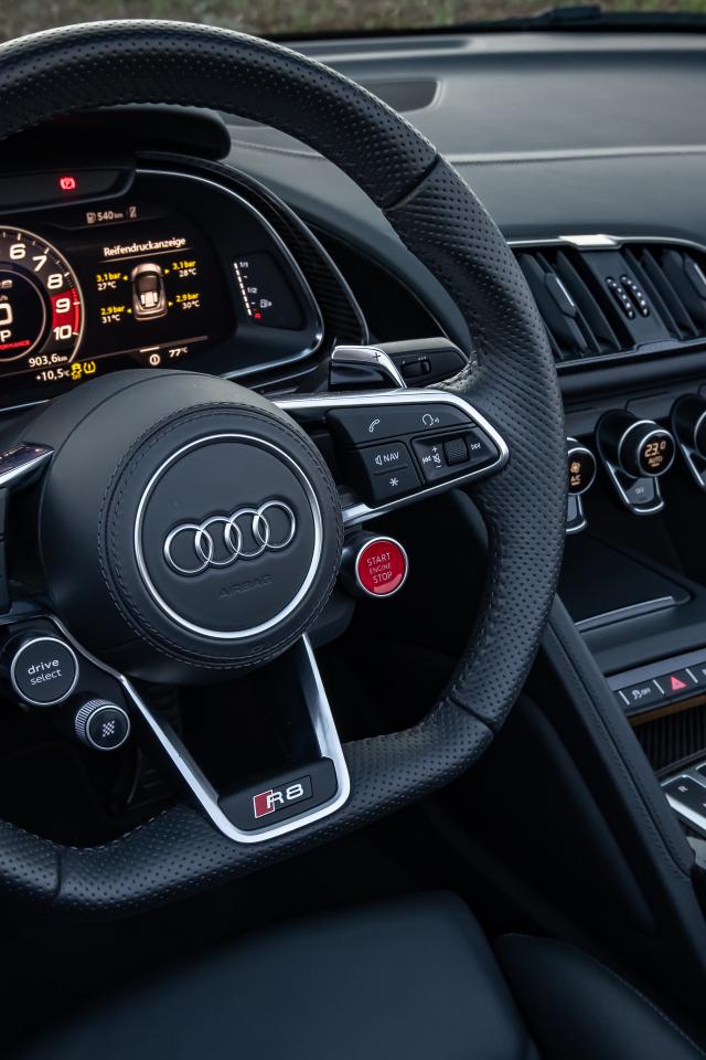 Обои Черный кожаный руль в автомобиле Audi R8 V10