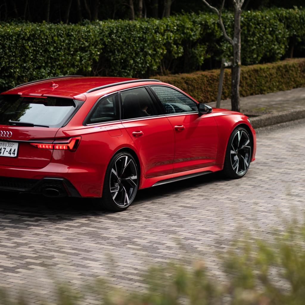 Обои Красный автомобиль Audi RS 6 Avant 2021 года вид сзади