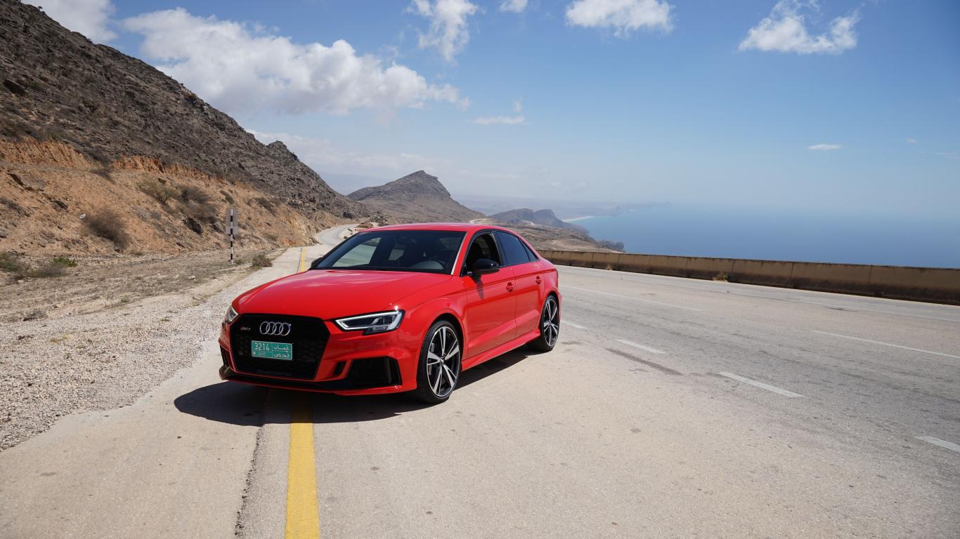 Обои Красный автомобиль Audi RS 3 на трассе на фоне голубого неба