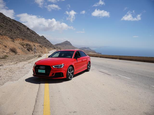 Обои Красный автомобиль Audi RS 3 на трассе на фоне голубого неба