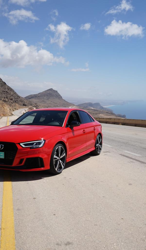 Обои Красный автомобиль Audi RS 3 на трассе на фоне голубого неба