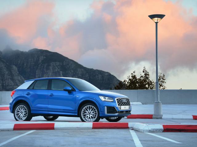 Обои Синий автомобиль Audi Q2, 2017 года на фоне гор