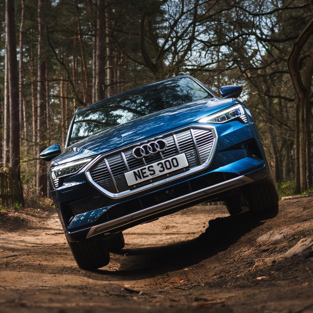 Обои Синий внедорожник Audi E-Tron 55 Quattro 2019 в лесу