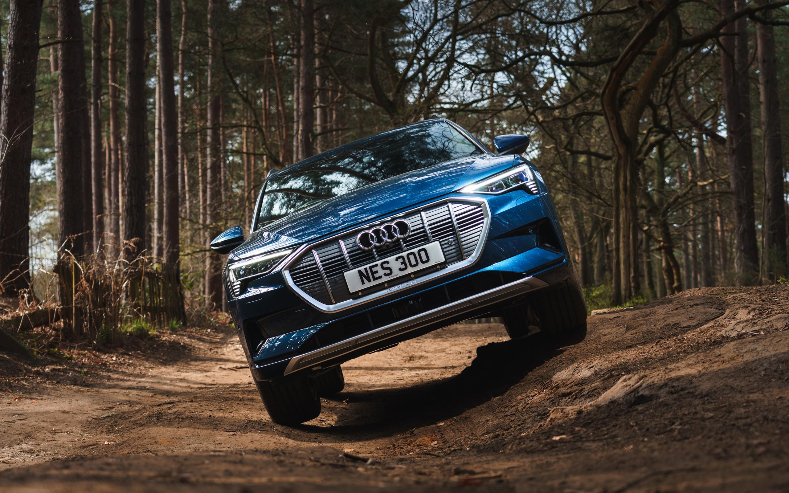 Обои Синий внедорожник Audi E-Tron 55 Quattro 2019 в лесу