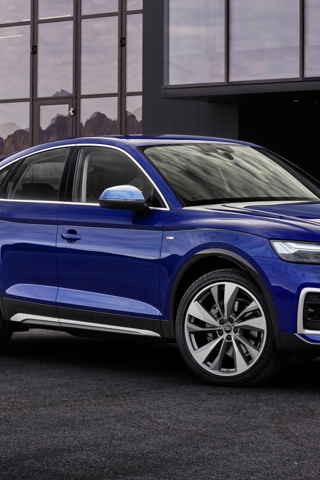 Обои Синий автомобиль Audi Q5, 2021 года у здания