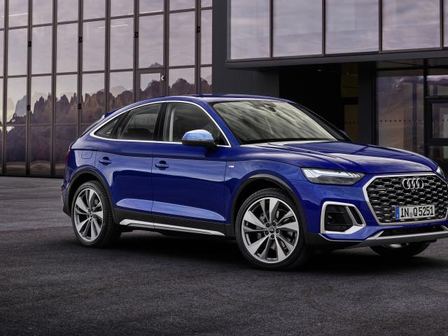 Обои Синий автомобиль Audi Q5, 2021 года у здания