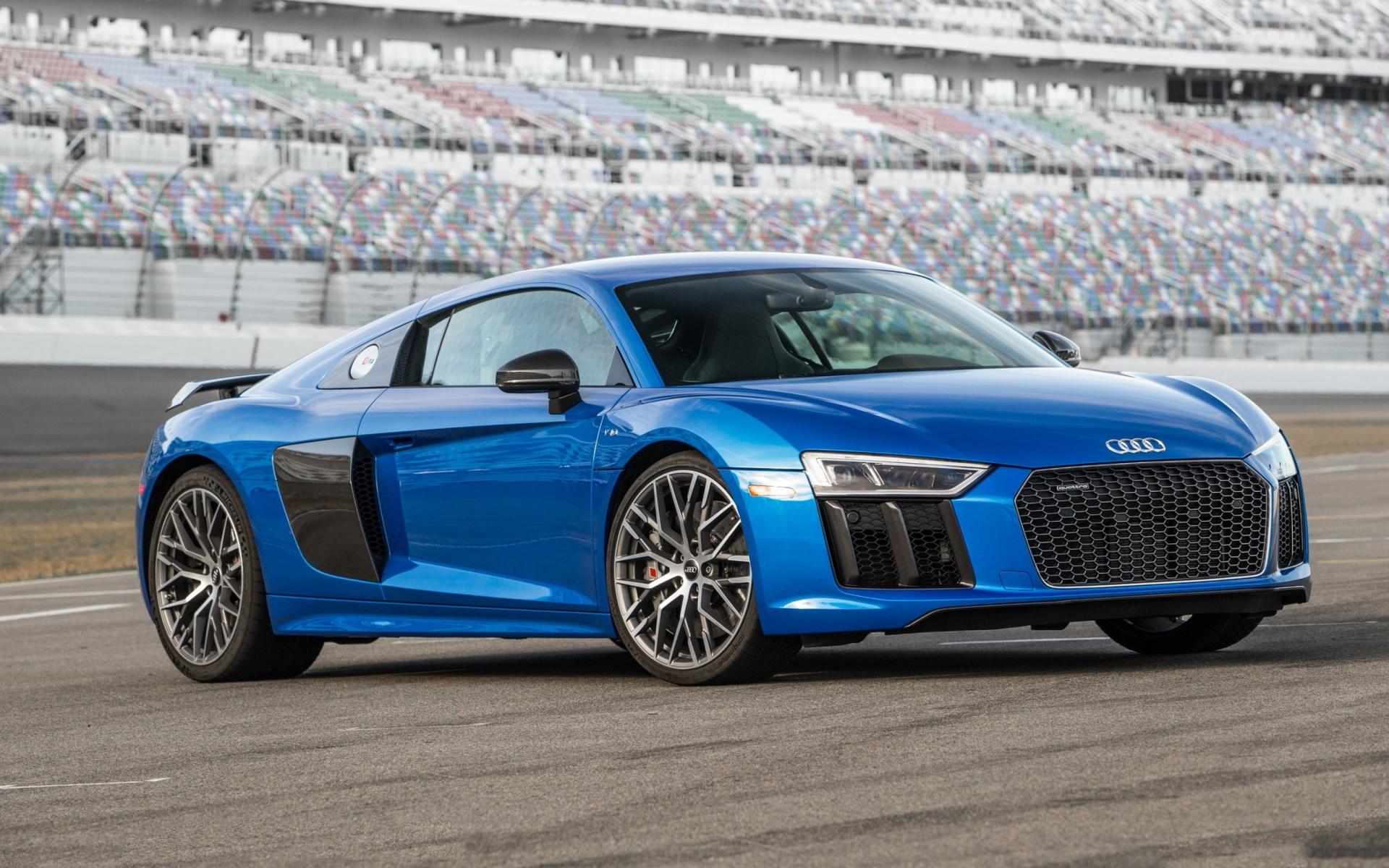 Обои Синий автомобиль Audi R8 V10 на гоночной трассе