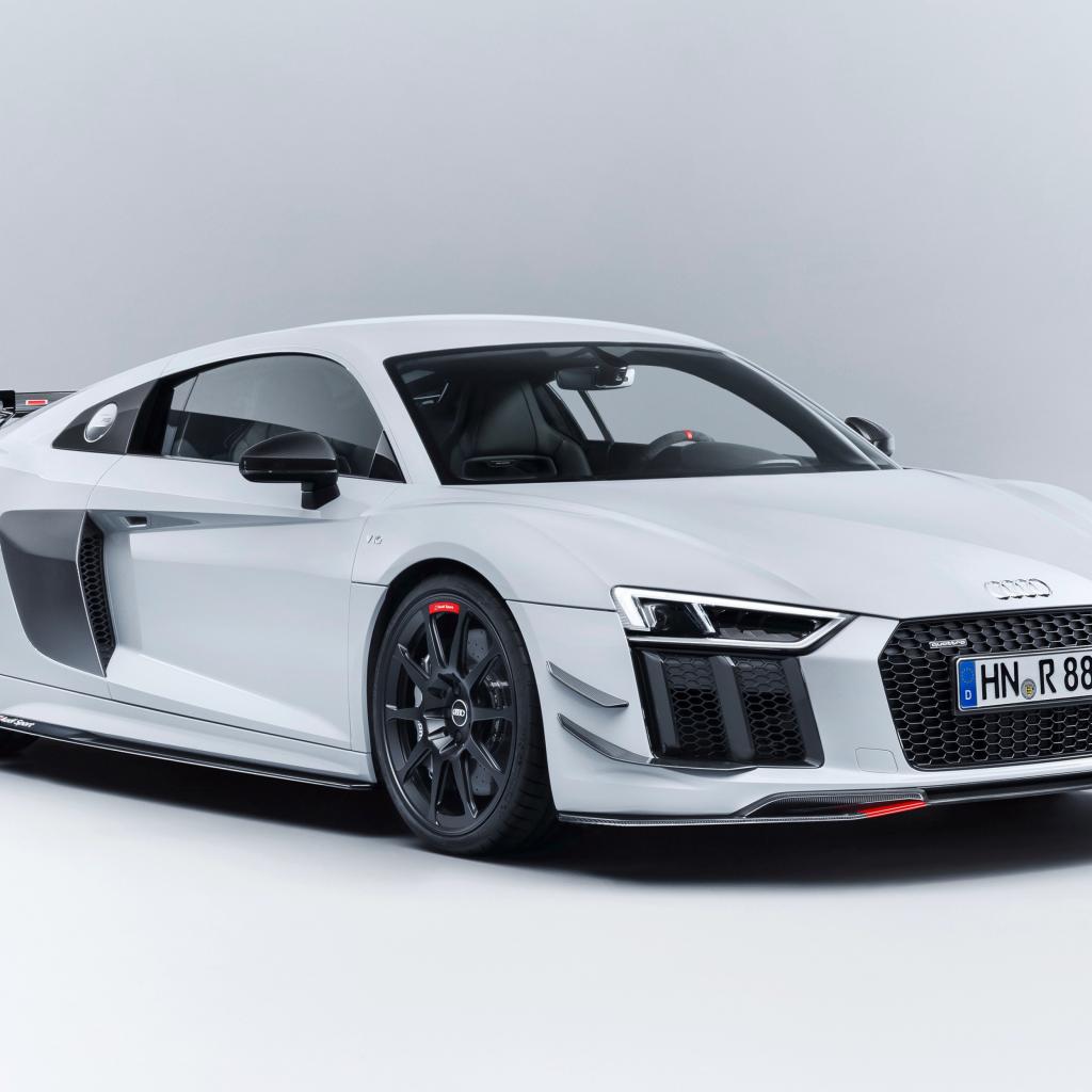 Обои Спортивный автомобиль Audi R8 v10, 2018 на сером фоне